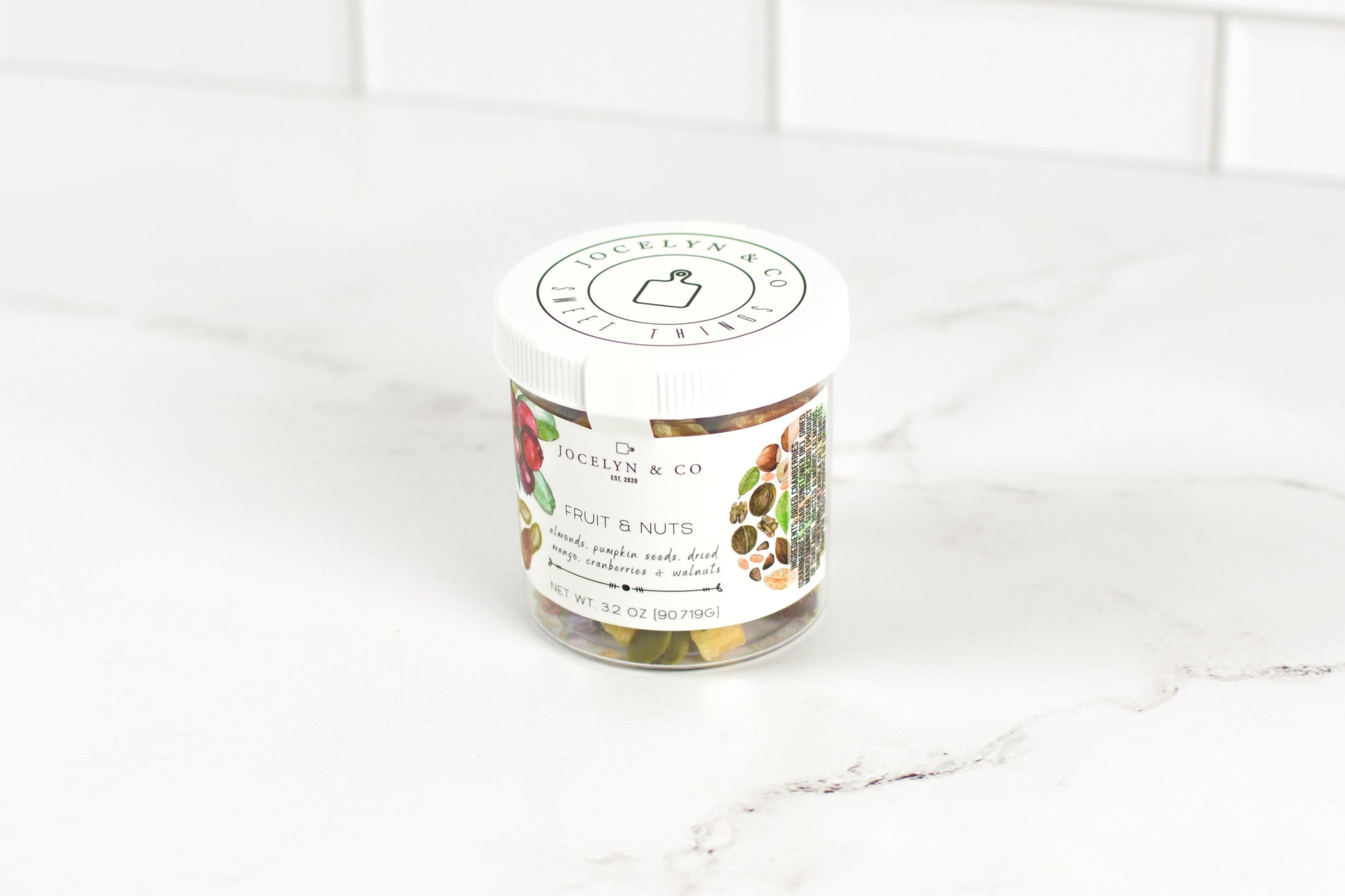 A vibrant mix of dried cranberries, dried mango, roasted almonds, walnuts, and pumpkin seeds—this Fruit & Nuts Medley is a crave-worthy balance of sweet, tart, salty, and crunchy. Whether enjoyed as a wholesome snack or paired with cheese and wine on a charcuterie board, it’s a versatile pantry staple. Packaged in our signature clear jar and created by a female-owned, small family business rooted in the art of gifting.